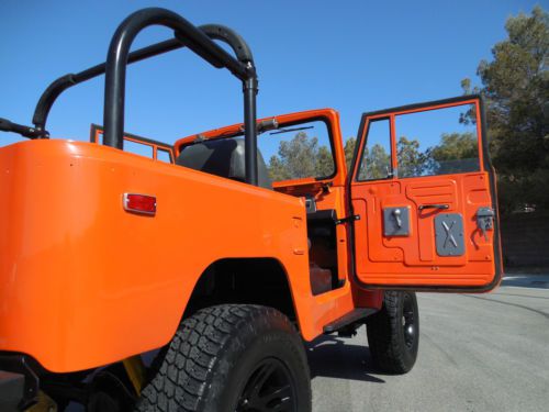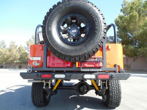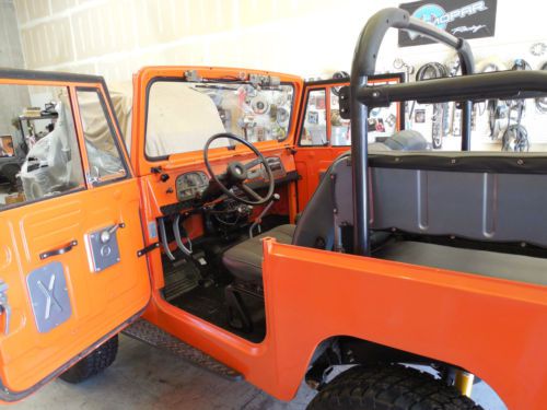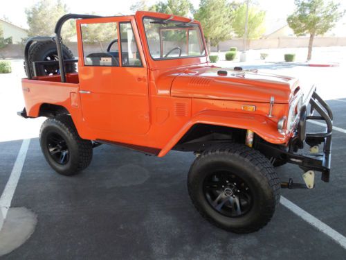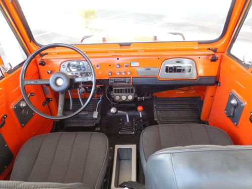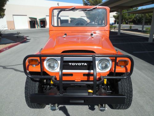 4 SALE, restored classic 1974 Toyota FJ 40 Land Cruiser. This FJ was a Body off - Frame Off - total ground up restoration. All new or like new parts used in restoration. The Body was removed from the frame and taken down to the original metal - small repairs made as needed. NO RUST - NO ROT the body and tub pans look outstanding = SEE ALL PHOTOS. Body was painted in a true FJ 40 Land Cruiser color of corral orange. Great color and this FJ will turn every head in town - driving in it "or" just parked on the street. The body - fire wall - inside motor bay - full hard doors - tail gate doors and so on all painted same as body. The inside was gutted / sandblasted and the inside floor pans all finished in black " water proof " raptor armor to keep the inside nice for many years to come. All new wiring and fuse box installed. The motor was updated to the Newer/ Bigger Toyota F-2 motor and was fitted with "header" and new exhaust. Motor also fitted with newer TBI " Throttle body injection" Yes = it has "fuel injection" so it runs outstanding on and off road. All the running gear under this FJ was also rebuilt like new. Under 3,000 miles on the fresh built F-2 motor - fresh built Toyota manual transmission and parts - Fresh built Toyota 4 by 4 transfer case and parts - Fresh built Toyota front and rear end, drive lines and yokes. All new 3 inch EMU suspension and lift. New Springs - spring hangers - bushings and shocks. Brakes also updated to new 4 wheel "power disk" ( wild wood ) with vented disk on the front. All new stainless brake lines and parts installed to frame. New master cyl and power brake booster installed. This FJ will stop straight and on a dime ! All steering parts replaced new - new steering box - new slave box - new tie rods - new bushings and joints. So it's easy to drive and drives nice. The frame rails and bottom side of this FJ also cleaned and detailed very nice when body off. Very nice bottom side = SEE PHOTOS ! IF this FJ was any cleaner inside or out - top to bottom you would not want to drive it and get it dirty ! This FJ is as "sanitary" as you will ever find one. It was built to drive and enjoy and is very reliable. I just drove it on a 200 mile week end road trip. This FJ ran outstanding, No Issues 50 lb oil pressure, 180 deg temp all day long. "" No Leaks "" under this FJ you can park it in your house on the carpet if you see fit! I have nothing to hide this FJ is much nicer than most for sure = SEE ALL PHOTOS and look at the parts list above. I have posted 25 large Photos of FJ ( Body and bottom side ) to show FJ in greater detail to out of town buyers. I have 50 more photos of the build and I will send extra photos to the buyer. I also have many extra parts the new owner will get. Two tops - one soft top " half cab bikini type top" - you will see in a few of the listing photos. I also have a (brand new still in the box) $ 1,100.00 " FULL Safari" black soft top with side and rear window. Full Top will cover both front and rear passengers = great for winter driving. 2 set of doors - One set of factory "full hard doors" with window glass on vehicle in photos. Also a extra set of 1/2 metal doors that will fit and lock in place. I have a like new carb and air clearer that will also fit it motor. Matching spare tire cover for rear tire. Extra seals and gaskets - extra fuel pump for motor and a factory Toyota power steering pump. ==== I have new spedo cable on order and new Land Cruiser Logo for side of hood on order will install when I get this week. Also a big box of other Toyota FJ stuff. I also have extra paint 1/2 gal of paint that it was painted in for exact match ( If you ever needed it ). This FJ is also 4 sale outside Ebay and this listing will be removed early if sold outside Ebay. This FJ will sell fast it's very nice and it's not rusted like most and I priced it very fair for the build it is. It' was built correct and is very Sanitary inside and out = top to bottom. All factory vin plates and numbers on FJ. Has factory Vin plate on driver door frame - Has factory vin plate under hood and factory vin number also on "frame" front passenger side as it should be. Clear title to buyer when paid in full. Seller will hold in locked garage until new owner can pick up in person "OR" have FJ transported to them. Call seller with any question you may have at 702-592-2181 anytime. If you're the buyer or win the auction = please call seller to work out final details. FJ Garaged in Las Vegas Nevada. Enjoy photos !
