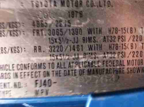 1978 Toyota Landcruiser FJ40, 76K original miles, great medium blue paint, interior has a professionally installed spray in liner, factory swing away rear tire carrier included(not on truck), new BFG spare tire, factory steel wheels (5), factory hubcaps (5), new BFG 33x10.5 mud terrain tires, besttop full soft top, besttop bikini top, car cover, man a fre front bumper and brush guard, front and rear receiver hitches, confer front storage box, factory rear auxiliary heat, factory rear jump seats, factory front disc brakes, off road lights on front bumper, original factory bottle jack, center console, pioneer stereo and CD player, pioneer speakers, cool cruisers of Texas front and rear mats, chilton manual included in sale, vehicle is in great shape cosmetically and mechanically, typical FJ40 rust has been professionally repaired, runs and drives great, everything operates as it should, solid vehicle, the truck is not perfect and shows signs of normal use, can be used as a daily driver or weekend warrior, truck is very reliable and a ton of fun, this is an "as is" purchase with no warranty, buyer arranges and pays pick up and/or shipping, will not ship overseas, you can drive it home if you would like, $500.00 non refundable deposit via PayPal due within 24 hours of close of auction, cash in person or cashiers check accepted within 7 days for remaining balance.