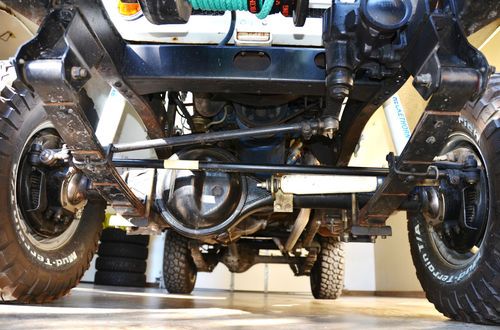 The 64' FJ45 under went a front axle and front disc brake conversion as well, replacing the front axle assembly with a late model FJ40 (1978) factory disc brake axle and late model FJ40 power brake booster and master cylinder. The axles were re geared to match the rear differential, and entirely over hauled with new inner axle seals, burfield seals wipers, retainers, hubs, rotors, calipers, brake hoses, brake pads, all tie rods, and links, and plumed hard brake hoses to the master cylinder.