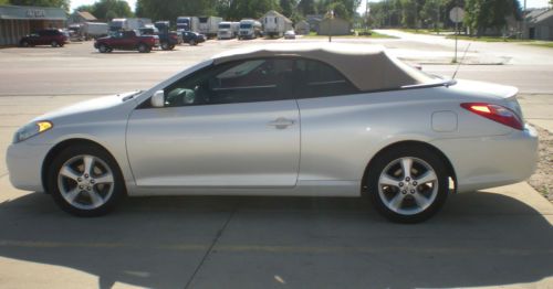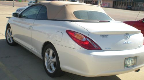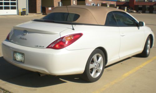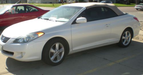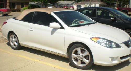 Up for sale is my 2006 Toyota Solara SLE Convertible. I recently purchased a 2008 so this one has to go, priced for quick sale. It has been my daily driver for about 3 years. Oil has been changed every 3,000 miles. It has nearly every option except navigation, it has leather interior with heated front seats. It is the pearl white with the tan top and interior. It was a certified used car when I purchased it. It now has 154,918 miles of which I have driven it about 110,000, I live in a small town so these are all highway miles. It has about 37,000 miles on a set of 85,000 mile Good Year tires. It includes the boot that I have never put on the car. Never smoked in. I have the clear, clean title. The car is in excellent condition, may have some very minor paint chips or dings that don't show in photos. The car is located in LeMars Iowa, which is 25 miles north of Sioux City. I will answer all questions to the best of my ability. Deposit through PayPal of $500 required. Cash or cashiers check when car is picked up.