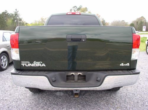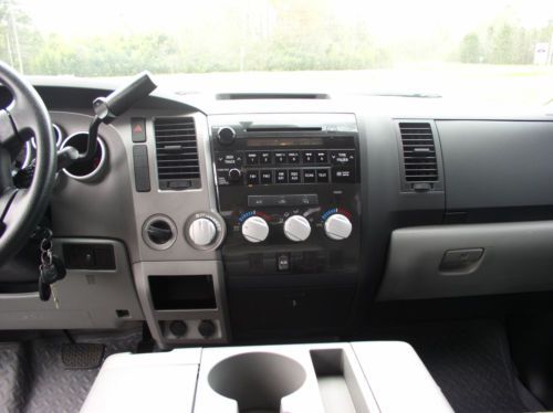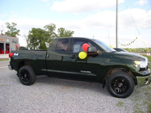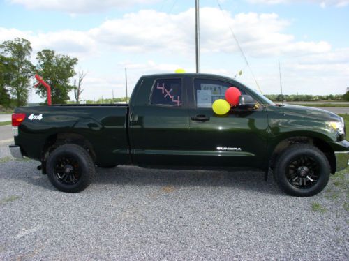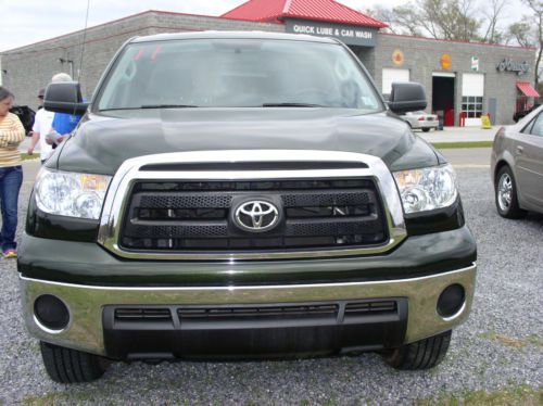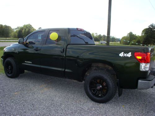 This 2011 Toyota Tundra 4x4 looks and runs great. It has a light gray cloth interior, with little to no wear. It is equipped with a 6 Disc CD Changer/MP3 Player with an auxiliary input. The paint is hunter green that looks great on top of the brand new 18" matte black MB TKO Wheels. The tires are also brand new. They are Falken WILDFREAK A/T tires, size 265/170 R18.