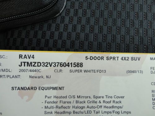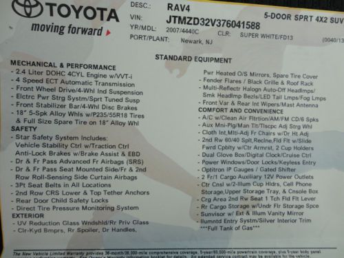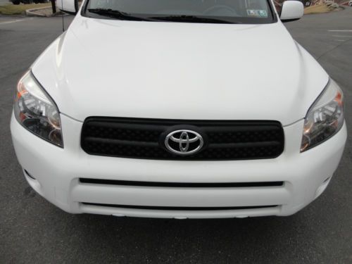 YOUTUBE VIDEO WARRANTY SINCE THE TOYOTA WARRANTY HAS EXPIRED, THE NEW OWNER WILL RECEIVE A 3 MONTH / 3,000 MILE LIMITED WARRANTY FROM THE DAY 'YOU' PURCHASE THE VEHICLE. WE ALREADY COMPLETED ALL RECOMMENDED SERVICE INCLUDING OUR 160 POINT TOYOTA INSPECTION AND COMPLETED A FRESH OIL CHANGE AND NEW STATE INSPECTION FOR THE NEW OWNER! CONDITION WOW, WHAT A SHARP, SPORTY, 2007 TOYOTA RAV4 SPORT EDITION FRONT WHEEL DRIVE 2.4L 4 CYLINDER IN SUPER WHITE PAINT WITH 75,167 ORIGINAL MILES. BEAUTIFULLY MAINTAINED AND INTERIOR IS IN EXCELLENT CONDITION AND A NON-SMOKER'S VEHICLE. BODY IS CLEAN AND FREE OF ANY MAJOR DINGS, SCRATCHES OR DENTS. THE TIRES ARE WELL ABOVE 75%. I WOULD PERSONALLY RATE THIS TOYOTA A 9 ON A 1-10 SCALE. I COULD ONLY FAULT THIS TOYOTA FOR TYPICAL STONE CHIPS AND I ALSO INCLUDED A VIDEO WALKAROUND OF THIS TOYOTA AND I ALWAYS POINT OUT ANY BLEMISHES I CAN FIND. THIS RAV4 IS A CLEAN TITLE VEHICLE WITH A CLEAN CARFAX WHICH WE INCLUDED WITH THIS LISTING AND THE ENTIRE HISTORY REPORT CAN BE EMAILED UPON REQUEST. OVERALL THIS IS A EXTREMELY CLEAN AND WELL MAINTAINED TOYOTA RAV4. I PERSONALLY INSPECTED THE VEHICLE AND TEST DROVE THIS TOYOTA AND IT FEELS LIKE NEW. IF YOU ARE SEARCHING FOR A CLEAN, BEAUTIFULLY MAINTAINED TOYOTA RAV4 SPORT FWD IN A GREAT COLOR, THIS IS YOUR NEW SUV! JUST SERVICED AND READY TO GO! BE SURE TO VIEW ALL 24 PHOTOS ALONG WITH FREE CARFAX REPORT! CLEAN CARFAX! CARFAX SUMMARY