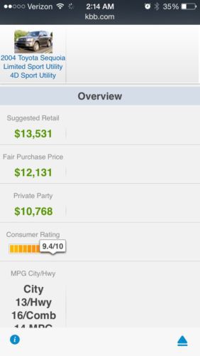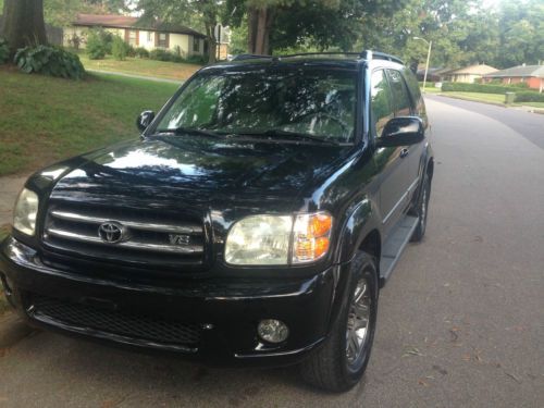 Beautiful black Sequoia Limited 4x4 V8 iForce. Lots of room. 3rd row seat. Roof rack. Towing package. JBL sound system. No major body damage. Professionally cleaned. Heated front seats. Rear AC/heat with separate controls. Non-smokers. Great family car. Extremely reliable. Research this vehicle! Best engine Toyota has made. Smooth drive. Never wrecked. Some cracks to interior leather. Please email with any questions! We love this vehicle and hate to have to sell it. Need money for cross country move.