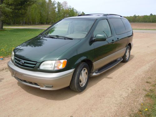 You are bidding on a 7-passenger 2001 Toyota Sienna with 161,500 miles in pretty good condition for the year!! This van is LOADED!!! It has Power windows, Power mirrors, Power Sun/Moon roof, Duel Power Sliding Doors, Power Drivers seat, Heated Leather Seats, alloy rims, cruise control, and radio controls on steering wheel. The middle and back seats do fold down and are removable. It does have some minor stone chips on the hood, as well as a few scratches and dings on the exterior. We have a clean title in hand with no lean on the vehicle. If you have any questions please call Kevin at 715-623-5891 or 715-216-6606. Watch video http://youtu.be/h5cqKHSl_lc