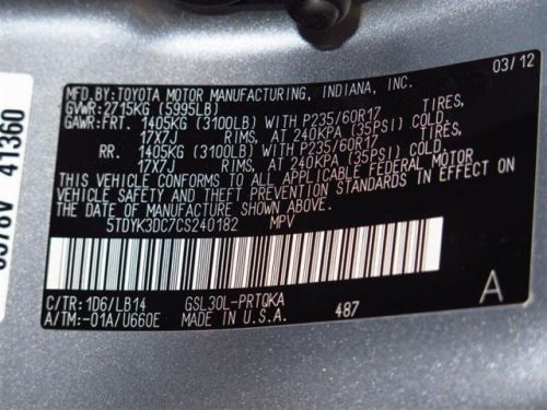 VIN (Vehicle Identification Number): 5TDYK3DC7CS240182