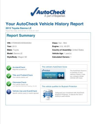 2013 Toyota Sienna 1 Fl Owner! Clean Carfax! No Reserve! Economic, Rear Camera on 2040-cars