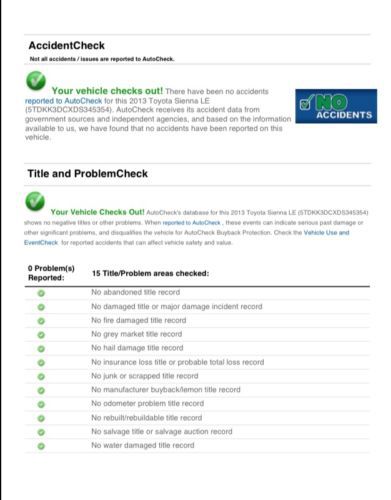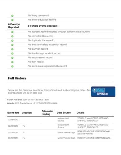 2013 TOYOTA SIENNA NO RESERVE AUCTION!!! We are a new small dealership here in Hollywood, Florida. We got this Toyota Sienna from a local auction. It has only 32269 miles! As you can see on Auto Check report, we have 1 Florida Owner Car, No accidents, and all maintenance has been done on time, 2 master keys. The car is in a great condition. There was a paint work done on the front bumper due to slightly scratching to a wall while parking in a mall parking lot. The vehicle doesn't have any issues to the best of our knowledge. We have a Clean Florida Title. PLEASE FEEL FREE TO CALL US AT 305-896-7717 Ask for SEAN. There are no license plate on this vehicle. Sales Tax and Registration fees are responsibility of the buyer and they are not included in the sale price. The buyer will have to organize to pay the shipping if it is shipped out of Hollywood, FL. Description provided is to the best of our knowledge.You are more than welcome to do all inspections. Please contact us to make an appointment. CONTACT INFO: Please contact us through Ebay using the "Ask seller a question" option, or directly by phone at 305-896-7717. Ask for Sean. We will do our best to make the sale as pleasant as possible for you. All Sales are FINAL. Non-refundable deposit of $299 is required within 24 hrs. Happy Bidding!!! Vehicle will not be released until ALL payments clear. Please take some extra time to look at all photo details, there is a lot of photos for you to understand the condition of this vehicle. |