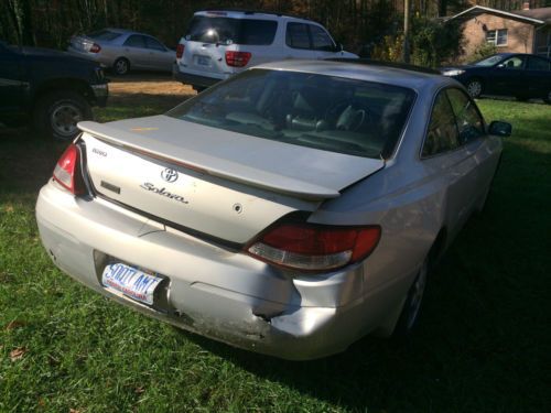 1999 TOYOTA SOLARA SLE V6. CAR WAS HIT IN THE BACK. IT RUNS AND DRIVES. CAR CAN BE FIXED OR USED AS PARTS CAR. HAVE TITLE. WILL BE SALVAGE TITLE BECAUSE INSURANCE TOTAL LOSS THE VEHICLE. ANY QUESTIONS PLEASE CALL ME 828-234-2555 BOBBY. THANKS