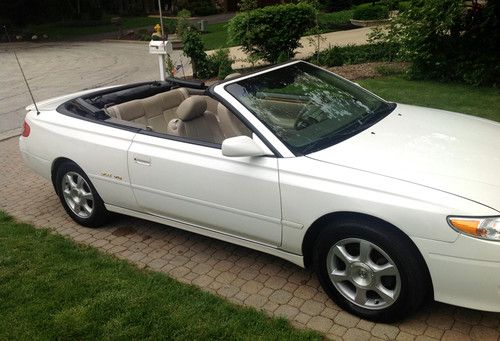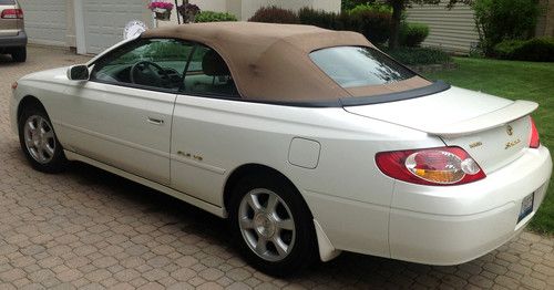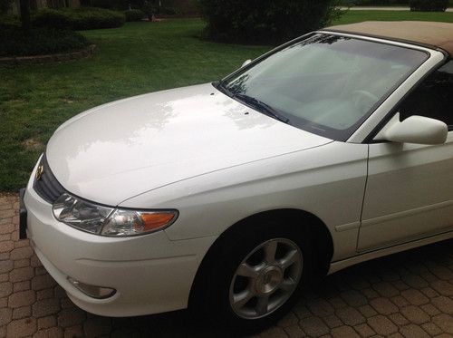 You are bidding on an absolutely gorgeous pearl white 2002 Toyota Solara SLE. Wood Trim, JBL sound system, top of the line model. Only 44,000 miles. Runs great, looks great, great fun. Freshly detailed, the paint is shiny, interior looks good, no major issues just a minor ding here and there. Great Toyota reliability with no mechanical issues , shifts smoothly. Overall an excellent value. I would give the exterior an 8 with a few minor dings, the interior is a 7 to a 7.5 no rips or tears, looks good, the top is 7. The front right tire doesn't hold air well but that's the only major issue.