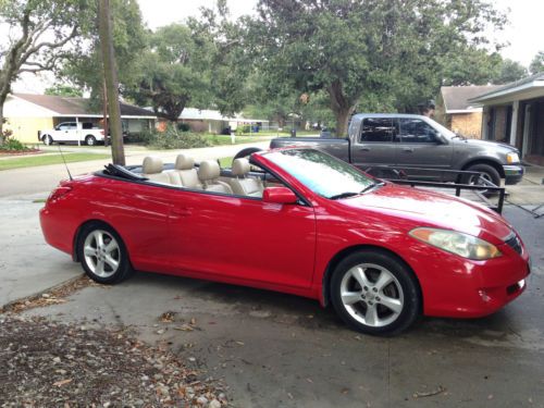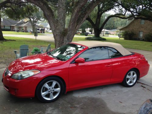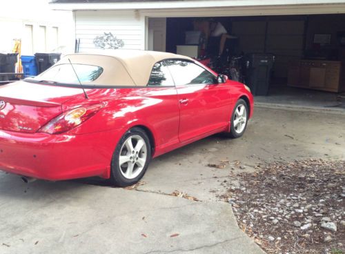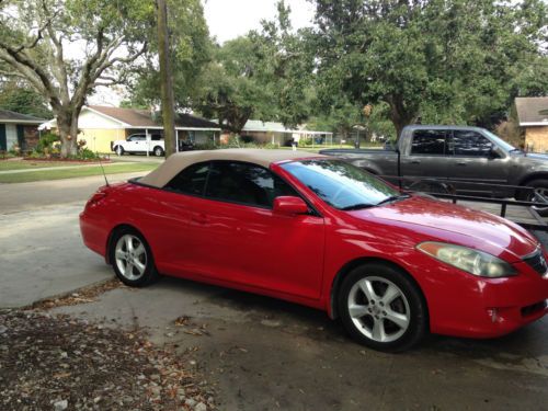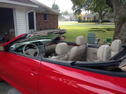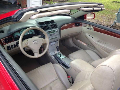 For sale is our Red V6 Solara Convertible, it has all leather with wood grain on dash and doors. Its fully loaded with 8 JBL speaker premium audio (Radio, 6 CD player, Cassette player), - Power driver seat, - Integrated fog front lamp, - Driver side auto dimming mirrors. Cold A/C, heated seats. A new convertible top was put on it last year. It has a tear in the pocket behind the driver seat and a small dent in passenger door. "look at pictures" It has 144,000 miles which is not much for a Toyota. It's a great car...we just need more room now as our kids are getting older. Email if you have any more questions. Thanks. Eric