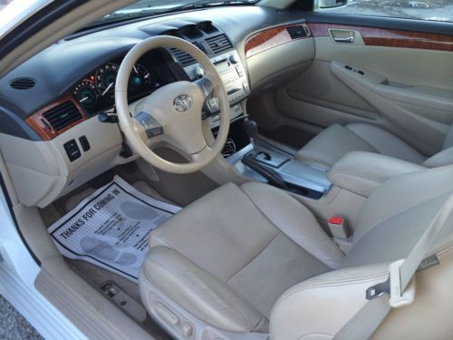 This is a 2007 Solara SLE V6 Super Luxury Edition, top of the line coupe, in a shiny pearl white color which is an added option because it's a beautiful color and uses a pearl paint instead of regular metallic. Super clean and never been smoked in! Dealer maintained and serviced, with a detailed up to date car fax to prove it. This car is loaded with heated perforated TAN leather seats, sunroof, alloys, JBL 8 Premium Speakers, blue-tooth on the wheel , COOL FACTORY LED LIGHTS and V6 210 HP engine, plus spare wheel. If you have any questions regarding this car or the price or would like to see more photos, feel free to send me a message! |