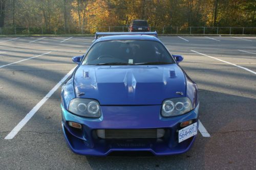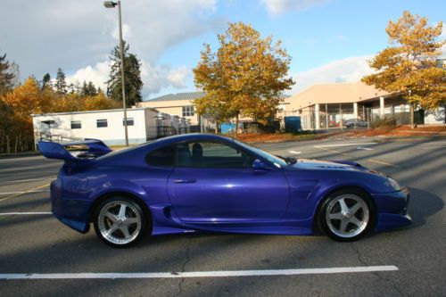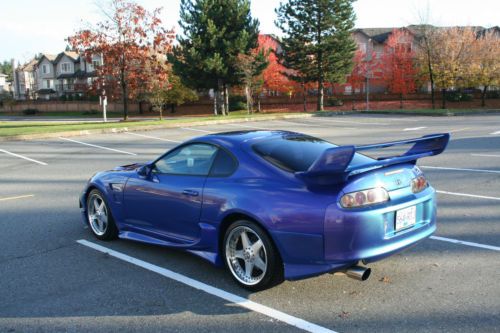 Fresh from Japan ! Finally on the market! I call this car a Celebrity because for the past two months it was featured in multiple blogs, articles, Facebook pages, forums, etc. as a very unique and beautiful car. It has a COMPLETE Veilside wide-body kit, including Veilside Aero Mirrors and Veilside rims! Only the body kit is valued at $15K. As you can see the original color is 8L5 known as Royal Sapphire Pearl. I did some research and found out that Toyota used this color between 1997-1998 on a number of only 31 cars - 24 Twin Turbo and only 7 NA, which means that beside this car only 23 other TT Supras have the same color in the whole world. And all of them are made in 1997 - 15 years Anniversary Edition - extremely rare stuff...This car has two supplementary paint coats: one purple and one green; depending on the angle you are looking for you'll see different colors and shades, due to the Pearl effect. The car has 137440 KILOMETERS, not MILES and was driven only in Japan. As the time passes, the Supras appreciate in value due to the fact that are limited in numbers and it is harder and harder to find a clean and well maintained one. As you can see from the pictures, this car is in A condition, except for some very small deficiencies, specific to all Toyota Supras. In many instances it looks better than many cars sold here, on eBay, having the mention of "mint condition" or "factory condition". The interior was well maintained, cleaned and steamed. It's an extremely beautiful car; in Vancouver, where I live, more than half of the car drivers and pedestrians turn their heads when the car is passing by. It's a special feeling to know that you are envied because of the car you are driving. The awesome specific shape and color, the unique body style, the 265/18" rear wheels and 245/18 front wheels with expensive Veilside rims - all contribute to an unmatched look which only a true racing car can bring. Being an 1997 Anniversary Edition it has the black tinted stop lights and headlights, which gives a plus of elegance. The Veilside kit is perfectly integrated into the car's body, flowing with body's contour. Whoever did the job did a work of art! The engine is TT stock! which means you can start any project car you'll want! The Supra coupe has been Toyota's sports-luxury-performance flagship since the days when it was the upscale Celica model. Originally introduced as the Celica Supra back in 1979, it gained increased distinction from the rest of the Celica lineup with a second generation in 1982, and became a separate nameplate in mid-1986. The first turbocharged version went on sale in 1987, pointing toward the high-tech, high-performance future of the car. With the debut of the current, 4th-generation in 1993, the Supra became a very serious performance machine. Performance levels are higher today than 15 or 20 years ago, and the 320-horsepower Supra Turbo offers near- supercar performance levels with better comfort and civilization levels than most cars in that class. The 220-horsepower standard Supra isn't exactly slow, either. Toyota considers 1997 to be the 15th anniversary of the Supra, and all 1997 Supras have special commemorative badging. Most significantly, a 6-speed manual transmission is available in Turbo models. This is very much in keeping with the car's seriously sporting nature. Few cars combine style, performance, and comfort as well as the Toyota Supra Turbo. The 1993-1998 Supra Twin Turbo is often referred to as the most over-engineered car in history. The Toyota Supra Twin Turbo together with the Veilside body kits were both featured in the major motion picture “The Fast and Furious”, and have been featured on numerous other television shows due to their immense popularity and mystique. There are multiple celebrities, athletes, and other ‘famous’ people who own these cars due to their reputation APPEARANCE: The Toyota Supra is a front-engine, rear-wheel drive car like the classic sports and racing cars of the 1950s and early 1960s. Without consciously imitating any other machine, it has the look of a performance car of that era, with certain modern updates. The transparently-covered headlights, long hood, and small fastback passenger cabin set well to the rear of the car give the classic look of speed. The high rear wing, oversized exhaust tip, and ultra low-profile high-speed tires on polished alloy wheels are contemporary touches. The basic styling has been unchanged since the car's introduction in 1993, although there are minor trim changes for 1997, and the previously-used tinted cabin glass is replaced by high solar energy- absorbing glass for cooler interior temperatures. COMFORT: The Supra Turbo is a driver-oriented car, and a driving- oriented car. Driver comfort is important for alertness and safety, and is not ignored. Supportive power front bucket seats, a tilt-adjustable steering wheel, and a first-rate climate control system see to that. Cup holders and storage spaces can distract from driving attention, and are de-emphasized. Instrumentation is important, and the Supra's instrument panel wraps around the driver cockpit-style to ensure that all gauges and controls are readily accessible. The short-throw gearshift lever is placed in just the right spot. There is a "2+2"- style rear seat in the Supra. As is typical of sports cars with such, it is best used as luggage space. Head and legroom back there are not exactly minivan-class, and the luggage space under the rear deck cargo shade is suitable only for a medium-sized briefcase. Don't think that the Supra Turbo is a spartanly-appointed race-replica. Standard power windows, mirrors, and door locks, a premium sound system, and useful interior lighting make it a civilized grand touring machine. SAFETY: All 1997 Toyota Supras have a strengthened uni-body structure with a rigid safety cage passenger compartment, front and rear crumple zones, standard antilock brakes, and dual airbags. ROADABILITY: The 19