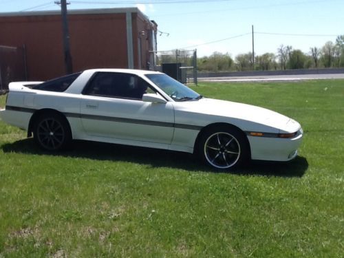UP FOR AUCTION IS A BEAUTIFUL 1989 TOYOTA SUPRA TURBO HATCHBACK WITH SPORT ROOF. HAS A 3.0 LITER V6 TWIN CAM 24 VALVE TURBO WITH INTERCOOLER ENGINE (7m/GTE). MILES @ 123,867. SUPRA HAS HKS SUPER DRAGGER EXHAUST MUFFLER ( FULL AFTER MARKET EXHAUST ). SMOOTH SHIFTING AUTOMATIC TRANSMISSION. WITH A NORMAL TRANSMISSION OR SPORTS TRANSMISSION OPTION. HAS PRO-COMP BOOST GAUGE. CAR IS IN GREAT SHAPE WITH SUPER CLEAN BURGUNDY LEATHER INTERIOR. NO RIPS OR TEARS. THE EXTERIOR IS A SHINY PEARL WHITE PAINT. CAR HAS MINOR BACK WHEEL WELL SURFACE RUST. SUPRA HAS A SPORT ROOF. RIMS ARE 17 INCH PROLINE RACING ALLOYS. PRIMEWELL P2-900 TIRES WITH 80% TREAD. SOME FEATURES ARE POWER LOCKS, WINDOWS, & SEATS. VALOR DVD & RECEIVER (650 WATT) @ 6 INCH. DVD, CD, AUX, & AM/FM RADIO. VEHICLE WAS JUST SERVICED. IT'S A BEAUTIFUL CAR THAT IS READY TO BE DRIVEN!!!