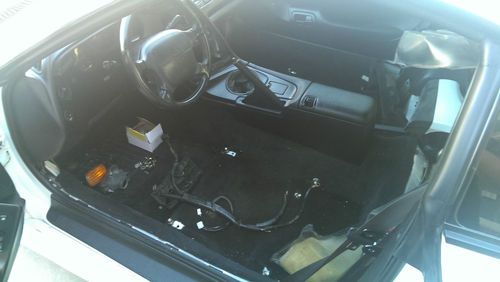 I have a rolling chassis white on black ex 6spd car. What you see in the pictures is what you will get. The car does not have a drive train and nor brakes. Comes as pictured with ground effects and inside the car is all the factory stock trim if you want to take it back to original. This used to be a show car that has been stored since 2006. The storage was not nice to it since there is a 4" scrape/dent on drivers front fender and the targa shows small dents which can be pulled by dent less repair. The interior will come pretty complete except for seats. Roll cage is optional its a mazworks cage good for 9.99. I do have some of the drivetrain still for sale if needed.