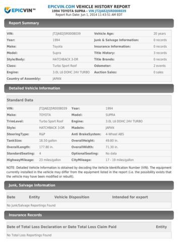 *** 1994 Toyota Supra Single Turbo ***ENGINE: - New Denso Starter - Compression and leak down test done (Results are within factory specs) - Brian Crower Cam Shafts - Power House Racing Upgraded Cam Gears - Aeromotive Fuel Pressure regulator and fuel rail upgrade - All stainless steel braided lines with proper AN Fittings - Dual Denso Fuel Pump Upgrade - Ported and Polished Intake Manifold - Brand New Comp Turbo, Triple Ball Bearing 67/68 T4 Trim, - AEM V2 Full Standalone ECU Professionally tuned by - HKS Turbo Timer - HKS Exhaust Manifold - HKS Front Mount Intercooler - HKS Blow Off Valve - HKS Hyper Dragger Exhaust and down pipe - Tial Waste Gate - 1000CC Precision Turbo Injectors - Power House Racing Front Air Inlet Plate - Power House Modified Single Turbo Water Neck -Greddy Oil Catch Can - TRD Oil Cap - Optima Red Top Battery - TRD Radiator Cap - Tuned and Dyno'd conservatively for reliability on 14psi. Roughly 450whp. MAINTENANCE: - Automatic Transmission was rebuilt 1,000 miles ago. - Timing belt service and full engine reseal was done 1,000 miles ago - Single Turbo Conversion and supporting mods were done 2,500 miles ago BODY: - 98' Factory Toyota Front Bumper - 98' Series II Headlights - 98' Front Turn Signals - 98' Front Turn Signal Harness - TiTek (rare) Carbon Fiber Front Bumper Lip Spoiler - Original paint on all panels - Original Matching VIN tags on all body panels - No door dings, ripples, or dents. Very minimal rock chips - Paint is outstanding, clear, glossy, and smooth. CHASSIS: -Work Kai Emotion CR 18X9 and 18X9.5 - Brand New Dunlop Direzza Tires (Roughly 2,500 miles) - Eibach Lowering Springs - New Factory Toyota Shocks - Half Roll Cage (Welded NOT bolted) INTERIOR: - Custom Painted Chameleon Interior Dash Panels and Engine Cover - Full Interior Dash Button Upgrade to LED - OEM JDM Supra Steering Wheel - JVC Double DIN Head Unit, CD, AUX Port, and USB - Autometer Boost Gauge, Digital AFR Gauge, and Clock Please do not bid unless you have the financing or Cash INTERESTED IN BUYING THE CAR OUTRIGHT ....