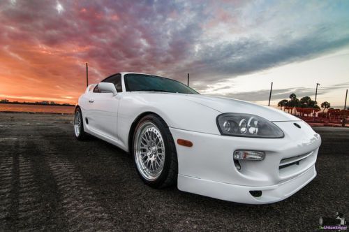 Quick Summary Automatic, original Twin Turbo 74,250 original miles All VIN stickers in place; clean title, no accidents Ground-up restoration including full 1998 exterior (including bumpers) Entire car painted factory white 040 with a clear coat on top (really nice paint job) Single turbo Full fuel system Built motor Engine Eagle Rods JE Pistons HKS 272 cams Precision billet 6765 turbo (freshly rebuilt in mid-Dec just before E-85 dyno tune). HKS exhaust manifold Greddy 60mm wastegate 4” stainless downpipe and mid-pipe by Sound Performance (v-band clamps of course) Re-circulated wastegate dump tube Tial BOV HKS Titanium exhaust (only the best) Greddy 3-row intercooler MVP motorsports radiator plate MVP motorsports upper radiator hardpipe New ATI crank damper and belt (mid-December) New tb tensioner HKS oil filter relocation kit Induction Performance catch can with -10 lines to valve covers Billet hood props Tons of chroming under the hood Edelbrock nitrous system with purge (75hp pill; never sprayed) High-end ball & spring boost controller (the best really; no annoying actuators) Transmission Titan fully built Stage 2 trans (600 miles) Titan 3,500 stall torque converter (600 miles) B&M Supercooler (600 miles) Fuel System Sound Performance fuel rail Precision 1,000 cc injectors Dual Bosch 044 pumps Dual Aeromotive stainless filters Aeromotive fuel pressure regulator Crimp fitted stainless steel fuel lines with Teflon insides for e-85 Electronics AEM EMS v1 AEM Wideband sensor and gauge HKS DLI Ignition box Six new factory Toyota coil packs (600 miles) Green led conversion on instrument cluster to match radio JVC Video front with i-pod/i-phone hookups Suspension/Wheels 18” CCW Classics fully polished (600 miles on wheels and tires; basically brand new/mint) 18x10 front, 18x11.5 rears Front tires = 265/35/18 Hankook Rear tires = 315/30/18 Mickey Thompson ET Streets OEM NA rear brake conversion Front and rear calipers are beautiful gloss black Eibach lowering springs KYB shocks Exterior ’98 headlights ’98 tail lights ’98 markers/turns ’98 front bumper ’98 rear bumper Factory spoiler and front lip (pics show RMM front lip, but I replaced with stock lip very recently) New window tint all around at 80% Interior OEM black interior and carpet (original leather seats front and rear; probably an 8 out of 10; carpet and mats are perfect) Dash panels, shifter console, power window control areas done in a smooth flat black; very nice Brand new center console installed (zero miles) Final Notes This is a stunning car. Not one ding and paint is amazing (white Supras came from the factory with single stage (no clear coat) paint and tend to have a dull finish. This car was painted with a high quality base coat 040 factory white with clear coat. Exterior is a 10 out of 10. Wheels on the car are mint; not one mark; gorgeous. This car and build is the real deal and has received LOTS of love in the form of money and upgrades. Recent Service/Dyno Tune I just had an ATI crank damper and new timing belt put on the car at Dynosaur Performance (they do all the work for Powerhouse Racing, etc.) as well as a new turbo oil drain line in Dec 2013. This car does not leak any fluids from anywhere. Car was tuned for e-85 in Dec 2013 and made 571 rwhp at 20 psi (wastegate spring pressure only). The 1,000cc injectors are basically maxed-out at that level. The Dynosaur Performance dynojet has always read lower than others (probably closer to 585 to 590 rwhp on a more moderate dyno). Car should make 730 to 750 rwhp at full-tilt with this turbo. Reliable power is what the Toyota Supra delivers and the automatics just put down the power so well. This is an amazing street machine that will romp on just about anything. |