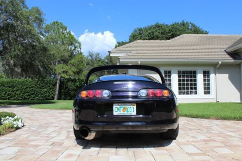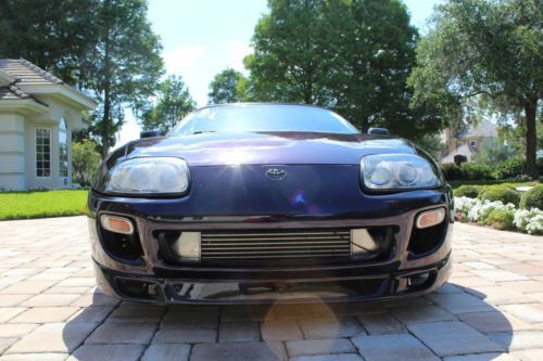 For sale is my 1995 Toyota Supra twin turbo with the sport roof. It has 69,500 genuine miles, which is very low mileage for a 20 year old car. It is an original twin turbo manual, no conversions. The car looks black, but upon closer inspection is a beautiful midnight purple when the light hits the paint. The CARFAX report shows one accident in March of 2003 where there was damage to the front and left rear of the car, but I have a clear FL title for the car in hand and there is no other reported accidents. Modifications to the car include a GReddy front mount intercooler, HKS Full exhaust, HKS SSQV Blow-off valve, HKS electronic boost controller, GReddy boost gauge and EGT gauge, A'PEXi S-AFC, AEM intake, and a JVC headunit and two MTX Audio 12" Subwoofers in the trunk . I'm sure there are more modifications that i'm missing here, too. The leather interior is in good condition for one of these cars, with not much wearing on the driver's seat, which is a common thing to happen to the interiors of these cars. The car has the stock toyota wheels that it came with, but they have been powder coated a darker shade of grey, which looks great with the paint.