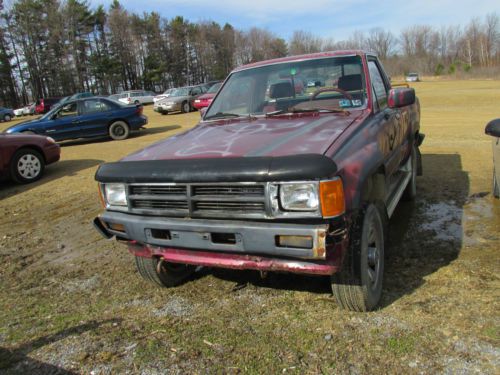 ------------------- BEING SOLD AS IS NO WARRANTY============ bad brakes beleive to be broken brake line 1987 toyota pickup 4 cyl 5 speed 4x4 high low range model. I drove this truck from a farm where it has been used as a farm truck for aprx 4 years....... good motor good transfer case good transmission good clutch selling as parts due to age and miles OVER 200k and are not actual miles odom does not work rust on body but not bad plenty of parts for more info call ej 814 659 7429 purchaser is responsable for picking up this vehicle must be paid for within 72 hours must be picked up within 14 days of sale IN ADDITION TO THE SALE PRICE A FEE OF 125.00 WILL BE CHARGED BUYER ALSO RESPONSABLE FOR TRANSFER FEES I am willing to pick purchaser up at latrobe airport johnstown airport or amtrak station On Apr-18-14 at 17:41:16 PDT, seller added the following information: Yes the truck does run transmission is good four wheel drive does work as I stated needs brake work poor brakes If you fix them you could drive it home I will pick purchaser up at latrobe airport Johnstowns airport or johnstowns amtrac at no charge Pittsburgh airport I can pick you up there for $50.00 to cover the gas and time On Apr-20-14 at 06:24:36 PDT, seller added the following information: 1987 Toyota Pickup SR5 listing on ebay shows as being a Tacoma pickup but is a SR5