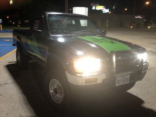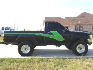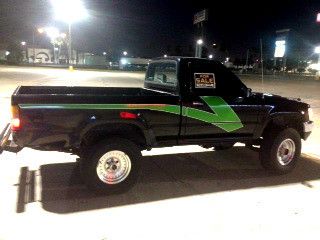 1989 Toyota Short Bed Deluxe for sale, 213,100 miles, 5 speed 2.4L manual transmission 4x4. Everything manual. I am not the original owner. This truck was purchased as a company daily driver truck, but I recently upgraded so now I need to sell. Clean title. Once again AC blows but needs freon. Everything else works as it should. Shifts real smooth. Has a tow hitch as well. Tires are practically new at 31s. I will submit several pics to give an expectation to the buyer in what is being bid on. Green graphics are vinyl decals. Good luck to all. Please email me with any questions you might have.