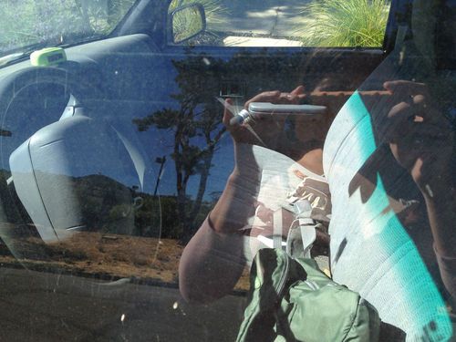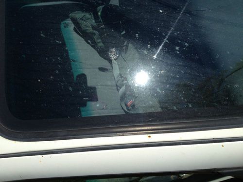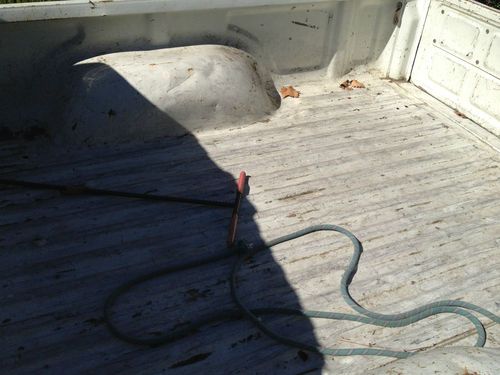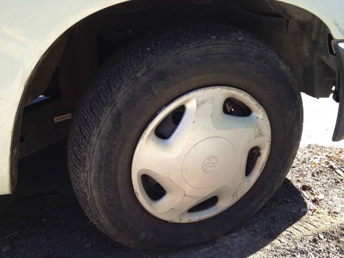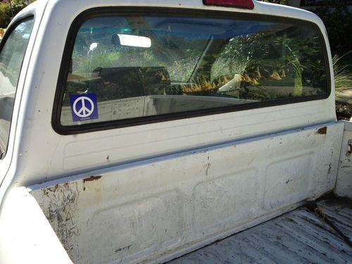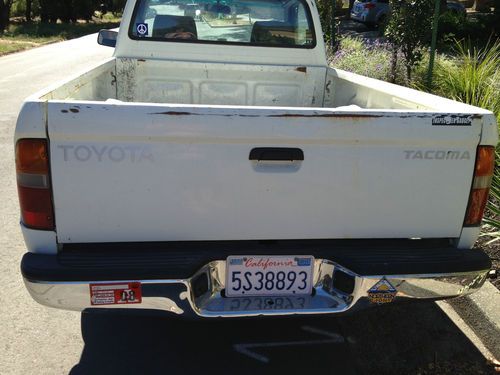 White Toyota Tacoma regular cab 2D pickup truck used as work truck. Scratches and stains on interior; scratches, some dents, on wheels and exterior. Bed does not have liner, some minor rust spots (see photos). Cab window does not open.
