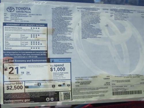 2 12V DC Power Outlets,4-Way Driver Seat -inc: Manual Recline, Fore/Aft Movement and Manual Lumbar Support,4-Way Passenger Seat -inc: Manual Recline and Fore/Aft Movement,CLOTH SEATS 60-40 Folding Split-Bench Front Facing Flip Forward Cushion/Seatback Cloth Rear Seat,Air Filtration,Analog Display,Cloth Door Trim Insert,CLOTH SEATS Cloth Front Seats w/Manual Driver Lumbar,Day-Night Rearview Mirror,Delayed Accessory Power,Driver Foot Rest,Entune Selective Service Internet Access,Front Bucket Seats -inc: 4-way adjustable passenger-side fold-flat seat, adjustable headrests, center console and drivers seat w/adjustable lumbar support,Front Center Armrest,Front Cigar Lighter(s),Front Cupholder,Front Map Lights,Full Carpet Floor Covering,Full Cloth Headliner,Gauges -inc: Speedometer, Odometer, Engine Coolant Temp, Tachometer and Trip Odometer,Glove Box,HVAC -inc: Underseat Ducts,Instrument Panel Covered Bin, Interior Concealed Storage, Driver / Passenger And Rear Door Bins and 2nd Row Underseat Storage,Interior Trim -inc: Metal-Look Interior Accents,Manual Adjustable Rear Head Restraints,Manual Air Conditioning,Manual Tilt/Telescoping Steering Column,Mini Overhead Console w/Storage and 2 12V DC Power Outlets,Passenger Visor Vanity Mirror,Power 1st Row Windows w/Driver 1-Touch Down,Power Door Locks,Power Rear Windows,Rear Cupholder,Regular Dome Lighting,Remote Entry w/Illuminated Entry,Urethane Gear Shift Knob,Argent Grille,Auto Off Aero-Composite Halogen Daytime Running Headlamps,Black Door Handles,Black Fender Flares,Black Front Bumper w/1 Tow Hook,Black Power Side Mirrors w/Manual Folding,Black Rear Step Bumper,Black Side Windows Trim, Black Front Windshield Trim and Black Rear Window Trim,Clearcoat Paint,Fixed Interval Wipers,Fixed Rear Window,Front Windshield -inc: Sun Visor Strip,Full-Size Spare Tire Stored Underbody w/Crankdown,Fully Galvanized Steel Panels,Integrated Storage,LED Brakelights,Light Tinted Glass,Regular Composite Box Style,Sp Get a FREE Car Detail with vehicle purchase!