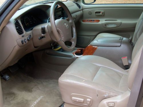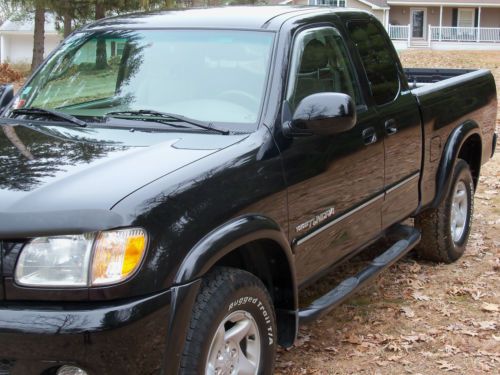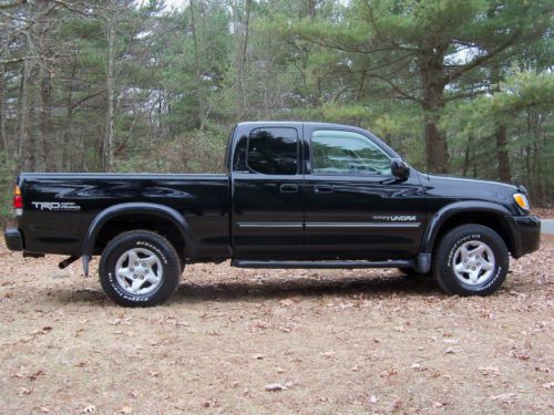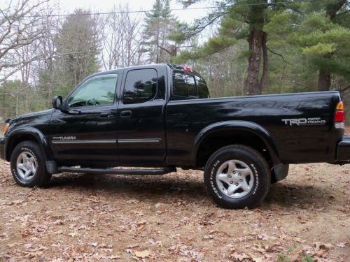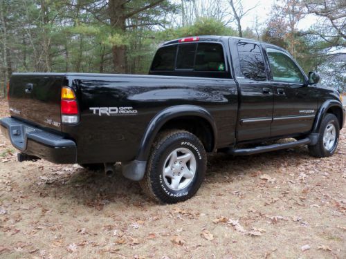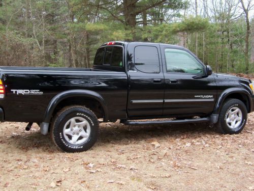 HERE IS A VERY WELL MAINTAINED 1-OWNER 2003 TOYOTA TUNDRA LIMITED WITH THE TRD OFF ROAD PACKAGE, HAS 170K HIGHWAY MILES WITH NO MECHANICAL ISSUES OF ANY KIND ON THIS VERY POWERFUL 4.7L ENGINE. OIL CHANGED EVERY 3000 MILES, ENGINE COMPARTMENT LOOKS VERY CLEAN WITH NO VISIBLE FLUID LEAKS ANYWHERE. THE ORIGINAL GLOSSY BLACK PAINT LOOKS REALLY NICE WITH ONLY SOME SMALL MINOR SCRATCHES, NO DENTS OR PAINT BUBBLING ANYWHERE, THE UNDERCARRIAGE IS ALSO VERY CLEAN WITH ONLY MINOR SURFACE RUST IN AREAS WHERE THE FACTORY COATING HAS BEEN FLAKING OFF, VERY SOLID WITH NO RUST ISSUES, THE BED HAS HAD A BED LINER SINCE NEW AND HAS PREVENTED ANY RUST ISSUES, FRONT TIRES WILL NEED TO BE REPLACED WITHIN 5K MILES, REAR TIRES ONLY HAVE 15K ON THEM, NEW FRONT BRAKES, THE LEATHER INTERIOR HAS SOME TYPICAL WEAR ON THE FRONT PASSENGER SEAT, FEW TEARS ON DRIVERS SEAT, REAR SEATS ARE LIKE NEW, TRUCK HAS NEVER BEEN USED TO PLOW , OVERALL A VERY NICE TRUCK MECHANICALLY AND STILL LOOKS AS NICE AS ANY 3 YEAR OLD TRUCK, ORIGINAL OWNER HAS ALWAYS HAD THIS TRUCK GARAGED, PLEASE ASK QUESTIONS BEFORE PLACING ANY BIDS IF YOU WOULD LIKE TO SEE ANY OTHER PICTURES OF A PARTICULAR AREA JUST ASK, A $1000 NON-REFUNDABLE DEPOSIT IS DUE AS SOON AS AUCTION ENDS AND THE BALANCE WITHIN 10 DAYS WILL BE FINE OR WHEN BEING PICKED UP, I CAN HELP FINDING A TRANSPORTER TO ANYWHERE IN THE USA AT NEW OWNERS EXPENSE, YOU WILL BE VERY IMPRESSED WITH THE OVERALL CONDITION OF THIS TRUCK, GOOD LUCK BIDDING!