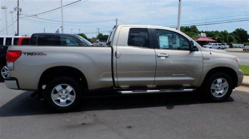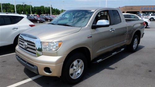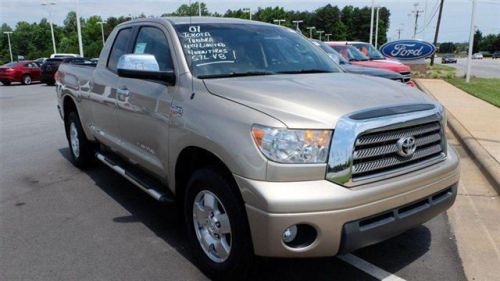 This 2007 Toyota Tundra 4dr 4WD Double 145.7 5.7L V8 LTD (Natl 4x4 Truck features a 5.7L V8 FI DOHC 32V 8cyl Gasoline engine. It is equipped with a 6 Speed Automatic transmission. The vehicle is Desert Sand Mica with a Beige Leather interior. It is offered As-Is, extended warranty is available. - Air Conditioning, Dual Zone Climate Control, Cruise Control, Tinted Windows, Power Steering, Power Windows, Power Door Locks, Power Mirrors, Leather Steering Wheel, Leather Shifter, Power Drivers Seat, Power Passenger Seat, Heated Seat, Tow Package, Clock, Tachometer, Digital Info Center, Homelink System, Tilt Steering Wheel, Steering Wheel Radio Controls, Driver Airbag, Passenger Airbag, Side Airbags, Keyless Entry, Security System, ABS Brakes, Traction Control, Rear Defogger, Fog Lights, Intermittent Wipers, AM/FM, CD Player, CD Changer, JBL Premium Sound System, 18 inch Aluminum Wheels, Leather Interior Surface, Four Wheel Drive,, Center Console, Sliding Rear Window, Compass And Temperature Display, Front Heated Seats, Running Boards, Compass And Temperature Display, Vanity Mirrors, Premium Sound, Premium Alloy Wheels, Center Arm Rest, Side Curtain Airbags, Locking Tailgate, Tow Hooks, Luxury Seats, Aux. Audio Input, Overhead Console, Heated Mirrors, 12v Power Outlet, Bedliner, Child Proof Door Locks, All Weather Floor Mats, Tire Pressure Monitor, Cup Holders -