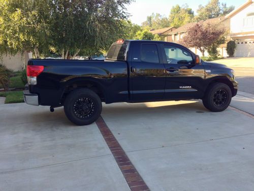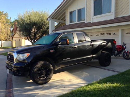 2007 Toyota Tundra. There is not a lot to say about this truck. I wanted the best and most reliable half ton and this was the obvious choice for me. It does have after market wheels and tires as you can see. Other than that there is an aftermarket radio with a USB cord and a bed liner. This truck has been great, but I need to get more economical and sell off some of my toys so I can go further my education and make a career change. So that means I have to get rid of this gorgeous truck. It is black just like a good looking truck should be. Also, as it is black it shoes imperfections here and there, but overall looks good.