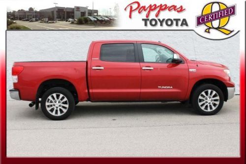 Let's just start by looking at the photos of this 2013 Toyota Tundra Platinum... take your time there is so much to see! Rugged underpinnings, loads of brawn, Toyota reliability, impressive safety features, and acres of interior space all add up to one heck of a truck! Much can be made of its better-than-adequate towing capabilities, its sturdy frame, and its spacious cabin. This 4X4's power comes from a 5.7L, V8 engine that pounds out 381 hp and 401 lb-ft of torque. The power-train is smooth, steady, alert, and reliable, especially when tasked with the heavy-duty work this vehicles does so well. Its beefy chassis will tame those beastly bumps out there. The cabin in our CrewMax Platinum is nice and roomy with leather upholstery, heated and cooled front seats, navigation, power sunroof, passenger climate controls, and more. Traditionally well-equipped for safety, the National Highway Traffic Safety Administration (NHTSA) gives the Tundra five stars for front and side impact protection. It's big, it's powerful, and most of all it's dependable! So, Print this page and call us Now... We Know You Will Enjoy Your Test Drive Towards Ownership! Please Contact a Member of our Sales Team For A Test Drive Today. **Please print this page and bring to our dealership** After printing this page and presenting it to one of our internet team members, you can experience the Pappas Toyota difference. We have been in business in St. Charles for over 30 years! Contact our internet department at 888-778-3792 Toll Free and we would be happy to assist you!