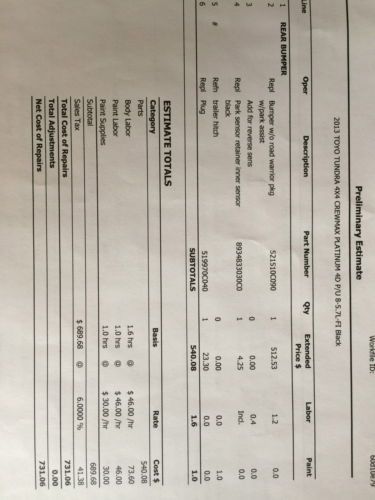 The Truck has less than normal wear a few scratches. The car fax will say it has had a rear end collision. No paint work only a new bumper see photo of work performed. Weather tech Mats included as well as a $900 Roll X bed cover. Truck has navigation a rear entertainment system and a TRD air filter. Tires only have about 6500 miles on them, aftermarket rims were on the truck for most of the miles. Original Sticker price was $52,496.00 Buyer is responsible for shipping or local pick up.