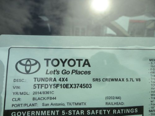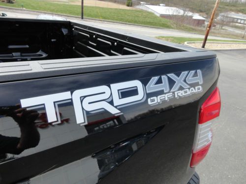 THANK YOU FOR VIEWING OUR BRAND NEW, JUST ARRIVED, ALL NEW DESIGN, 2014 TOYOTA TUNDRA CREWMAX 5.7L V8 TRD OFF-ROAD EDITION 4X4 WITH REAR CAMERA, TOW PACKAGE, BLUETOOTH, TOUCH SCREEN, ETC IN BLACK CLEARCOAT PAINT WITH SAND BEIGE FABRIC BUCKET SEATS WITH 5 ACTUAL MILES! WE ARE A TOYOTA DEALERSHIP IN WESTERN PENNSYLVANIA AND THIS NEW 2014 TUNDRA CREWMAX TRD 4X4 HAS A MSRP OF $40,890. WE ARE OFFERING THIS NEW 2014 TUNDRA CREWMAX TRD 4X4 AT A SPECIAL, DISCOUNTED 'BUY IT NOW' PRICE ON EBAY FOR A VERY LIMITED TIME AND INCLUDES THE TOYOTA REBATE. WE ARE ALSO OFFERING A LOW 2.99% APR UP TO 60 MONTHS WITH APPROVED CREDIT! PLEASE VIEW THE COMPLETE LISTING INCLUDING 24 PHOTOS ALONG WITH PHOTOS OF THE ACTUAL WINDOW STICKER. PLEASE CONTACT SCOTT LONG @ (866)467-8395 OR (814)659-1908 OR EMAIL TO LAUFORD@AOL.COM WITH ANY QUESTIONS. THANK YOU FOR VIEWING AND BE SURE TO VIEW ALL OF OUR EBAY LISTINGS AS WE CURRENTLY HAVE (11) BRAND NEW TUNDRA'S IN STOCK! BE SURE TO CHECK OUT OUR 100% POSITIVE FEEDBACK!