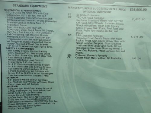 WARRANTY THE NEW OWNER WILL RECEIVE THE NEW TOYOTA WARRANTY WHICH IS A 3 YEAR / 36,000 MILE BUMPER TO BUMPER WARRANTY PLUS A 5 YEAR / 60,000 MILE POWERTRAIN WARRANTY. YOU WILL ALSO RECEIVE 'TOYOTA CARE' WHICH IS A COMPLIMENTARY 2 YEAR / 25,000 MILE FREE SCHEDULED MAINTAINENCE. PLUS WE INCLUDE A LIFETIME POWERTRAIN WARRANTY AS LONG AS YOU OWN THE TRUCK!! THIS IS VALID AT ALL TOYOTA DEALERSHIPS NATIONWIDE! WE ALSO OFFER EXTENDED WARRANTIES, PLEASE CALL OR EMAIL FOR PRICING AND DETAILS. EQUIPMENT LIST MECHANICAL & PERFORMANCE 50 State Emissions ......................... Total Accessories ...........................: $ 3240.00 SCOTT LONG (866)467-8395 - TOLL-FREE (814)659-1908 - CELL PHONE (call or text) VICE PRESIDENT OF INTERNET OPERATIONS / EBAY SPECIALIST FORD-LINCOLN-NISSAN TOYOTA-SCION-BMW CHRYSLER-JEEP-HYUNDAI DODGE-RAM TRUCK-EQUUS FAX (814)269-2346 EMAIL lauford@aol.com The top 5 reasons why our customer's travel hundreds and even thousands of miles to purchase from US instead of their local dealer: 1. Each of our vehicle's go through a multipoint 160 point inspection, and each vehicle has a unique description which I do personally on every vehicle. 3. Deal directly with a Manager and eliminate the salesperson! NO BACK & FORTH! I specialize in handling ALL Ebay transactions and I personally inspect the vehicle and take all photos & videos. Most of our customers have never purchased a vehicle through Ebay or over the internet and I am dedicated to walk you through the entire process from start to finish and make it a smooth and easy transaction. 4. We are set up to cater to the eBay buyer, and our main focus is selling cars in this market. 5. Each vehicle has a 100% Satisfaction guarantee! Check our 100% perfect feedback on ebay! (Ebay Seller since 2002!!!)