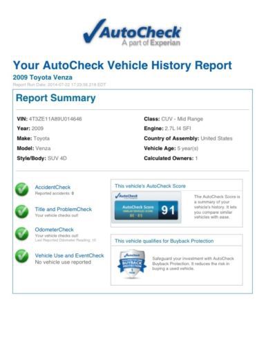 2009 TOYOTA VENZA We are a new small dealership here in Hollywood, Florida. We bought this Toyota Venza from a local university professor who drove it from his house to university (FIU). It has only 71800 miles! As you can see on Auto Check report, we have 1 Florida Owner Car, No accidents, and all maintenance has been done on time. It has 2 master keys. The vehicle doesn't have any issues to the best of our knowledge. We have a Clean Florida Title. PLEASE FEEL FREE TO CALL US AT 305-896-7717 Ask for SEAN. There are no license plate on this vehicle. Sales Tax and Registration fees are responsibility of the buyer and they are not included in the sale price. The buyer will have to organize to pay the shipping if it is shipped out of Hollywood, FL. Description provided is to the best of our knowledge.You are more than welcome to do all inspections. Please contact us to make an appointment. CONTACT INFO: Please contact us through Ebay using the "Ask seller a question" option, or directly by phone at 305-896-7717. Ask for Sean. We will do our best to make the sale as pleasant as possible for you. All Sales are FINAL. Non-refundable deposit of $299 is required within 24 hrs. Happy Bidding!!! Vehicle will not be released until ALL payments clear. Please take some extra time to look at all photo details, there is a lot of photos for you to understand the condition of this vehicle. |