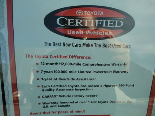 SINCE THIS IS TOYOTA CERTIFIED, THE NEW OWNER WILL RECEIVE 7 YEAR / 100,000 MILE POWERTRAIN WARRANTY AND IS VALID FROM THE ORIGINAL SALE DATE WHICH WAS JULY 15TH, 2008. YOU WILL ALSO RECEIVE A 12 MONTH / 12,000 MILE COMPREHENSIVE WARRANTY FROM THE DAY 'YOU' PURCHASE THE VEHICLE. WE ALREADY COMPLETED ALL RECOMMENDED SERVICE INCLUDING OUR 160 POINT TOYOTA INSPECTION AND COMPLETED A FRESH OIL CHANGE AND NEW STATE INSPECTION FOR THE NEW OWNER!