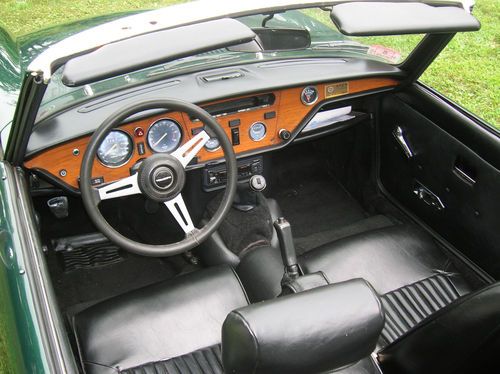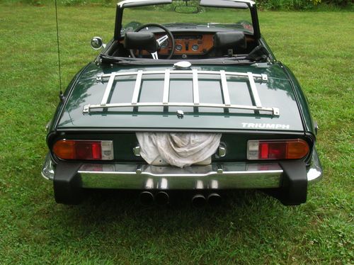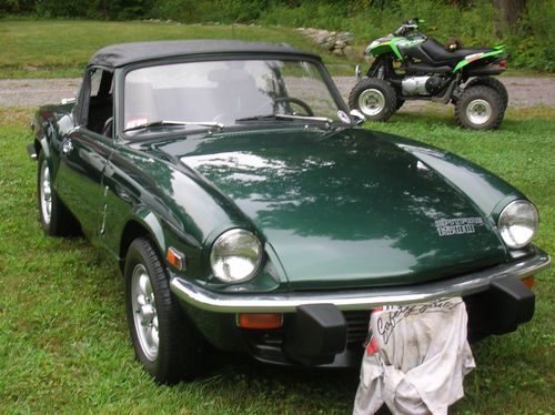 Up for sale is my 1975 Triumph Spitfire. This car was repainted and reupholstered in 2008. During that time the motor and tranny were sent out to Britek in New Hampshire for a full overhaul. The engine has a Reznor Cam and Stelite valves. This car comes with factory overdrive and hardtop. The Triumph has CD player, minilite wheels, and new tires. Although this is not a points car it shows very nicely as a daily driver. This is a very reliable British car. The ignition has all been replaced with Crane Fireball parts. This car will come with $500 worth of brand new spares. For performance upgrades this car has a Pecos hedder and full quad Monza exhaust, plus a Webber dual carb. This car performs, handles and brakes with no issues. I would not hesitate to drive it on any long distance trip. This car has never seen snow and hardly any rain. Very solid frame and body with no rust. The hardtop is also painted in matching British racing green.