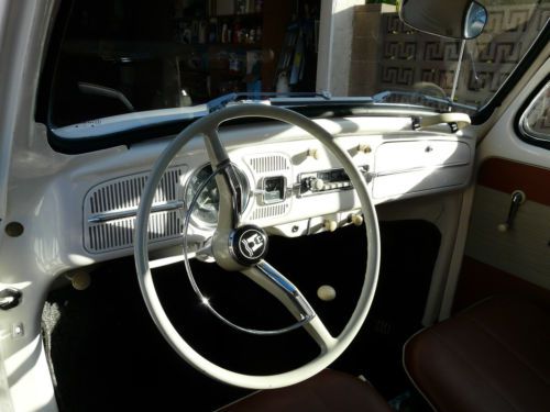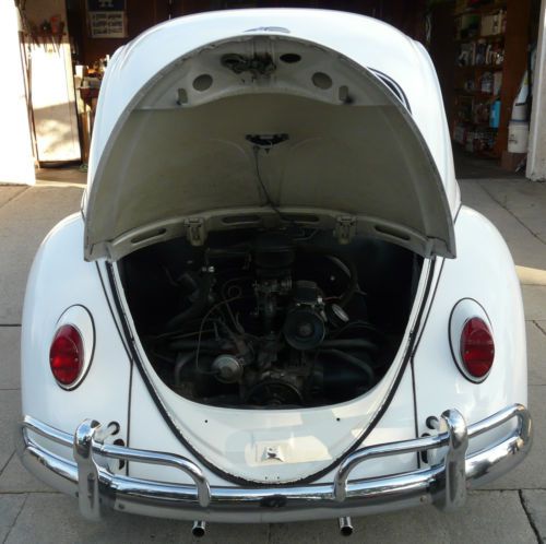 Original Southern California 1962 VW Beetle Coupe in "Perlweiss L87" white color NO RESERVE LISTING!!!!! Elderly owned by retiree at least six years before his recent passing. Car was his pride and joy. Always garaged. Outside repainted during this period and still shows well. Interior upholstery and carpet appears to have been redone. Slight rust on front hood edges and road rash under fenders but otherwise shows very well. Engine S/N 6757625 corresponds to late 1962 production, and is thought to be the original engine of this car. Factory markings are still present behind gas tank. Odometer shows just over 98,000 miles now (and is also believed to be accurate but I cannot confirm). VIN under rear seat matches front VIN plate. VIN also corresponds to late 1962 production. This vehicle looks like it was always maintained and taken care of. No engine oil leaks. Headliner appears original and has begun to sag. New starter, battery and four Bridgestone tires. Clean California title and current license registration in hand. Many other pictures available. Needs little to make perfect. The car is located in Los Angeles, close to the Port of Long Beach. If you are a foreign buyer and wish to export, I will gladly work with your shipping and forwarding company. I do have an interested party so if it does not sell I may or may not relist it. |