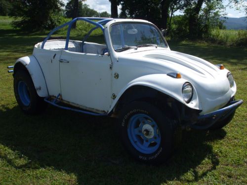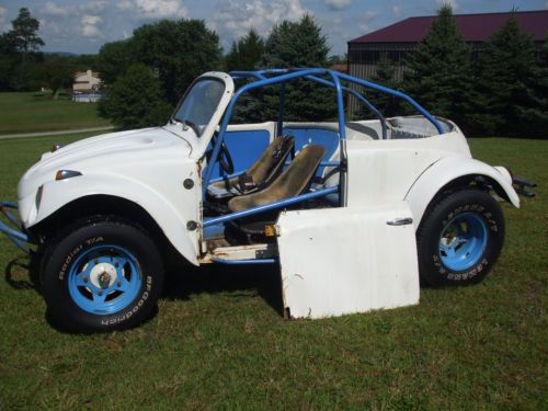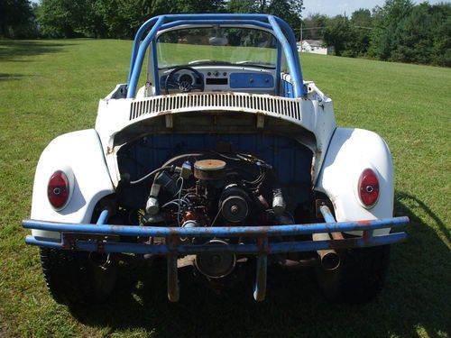 1963 VW beetle baja thats been modified into a convertible...bug has the original kingpin front axle and swing arm transaxle with a newer solid mounted 1600 cc dual port motor with electric fuel pump and unknown miles...motor fires right up with no noises or smoke and sounds good. Bug runs,drives and stops good...fiberglass tilt front end and rear fenders with some cracks and blemishes.Floor pan is very solid except where the battery sits.Great winter project or drive it as is...horn,wipers and lights work...tires are decent but do have some dryrot.Included with the sale is the drivers door that needs the lower hinge repaired,a tow bar,new speedo cable and factory rear seat.True mileage is unknown due to broken speedo cable.Vehicle is sold as is with no warranty and shipping is the sole responsibility of the buyer.Listing may end early due to having it for sale locally.