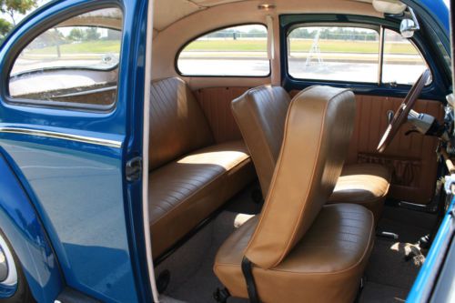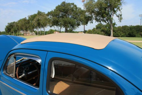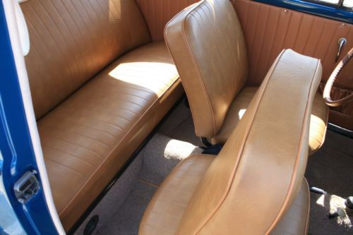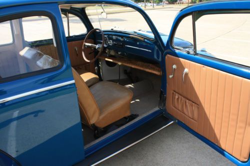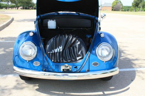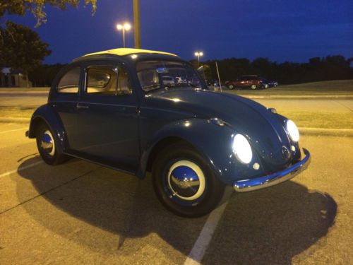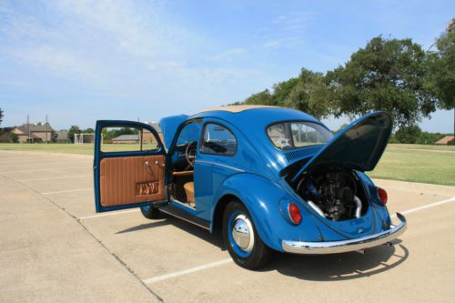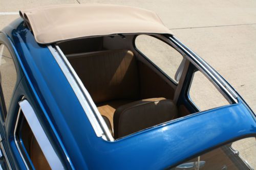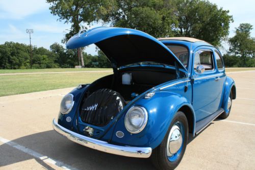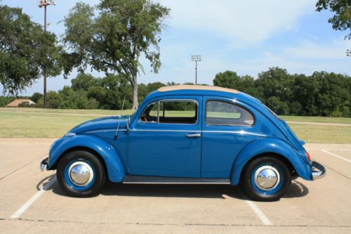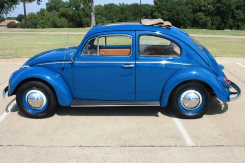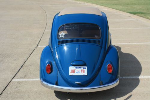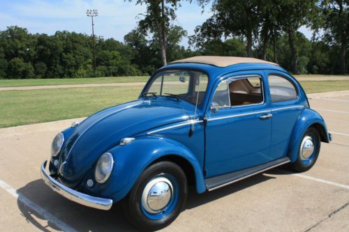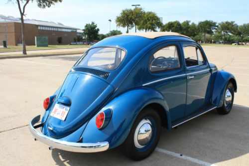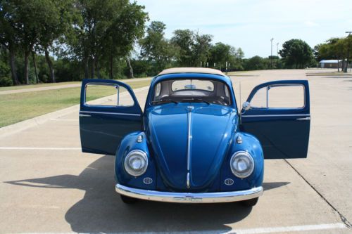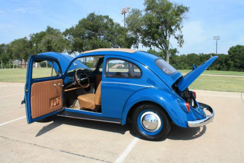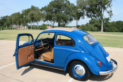 You are bidding on an Absolutely Beautiful Blue 1964 VW Ragtop Bug. This is a Fully Restored Ragtop Bug, the restoration was completed 2 years ago by a Professional VW Shop. The Paint has a deep Blue Gloss inside and out with a Beautiful Shine to it. New Chrome Bumpers, New Running Boards. The Tan Interior is all New, New Seat Covers, New Carpet, New Door Panels, New Door and Window Knobs, New Glove Box, New Visors, New Seat Belts, New Underdash Basket, New Panasonic CD Player, (Sounds Great) All New Rubber all around Windows and Doors (See Photos). The Engine is a Newly Rebuilt 1600CC, with New 4-speed Transmission, 3,800 miles on it. The Brakes are all New all around, New Tires and Wheels to complement the Paint Job. It has a New Tan Canvas Ragtop that works Perfectly. This car is such a Pleasure to drive, it runs Fantastic. If your looking for a Show Car this is the one, you can drive this Bug anywhere, its very quick and cruises great on the Highway. You will catch yourself driving for hours at a time, just open the Ragtop and enjoy going out on the town. If you live in the Dallas Area, you may see the car anytime during the Auction. Its sitting here at my Home in Plano, Texas. Good luck everybody, lets see who will own this Rare VW Ragtop. See Video: http://youtu.be/W9EkPFr5d-Q