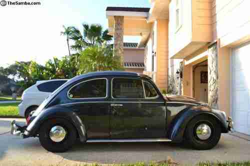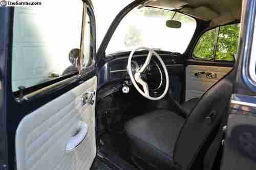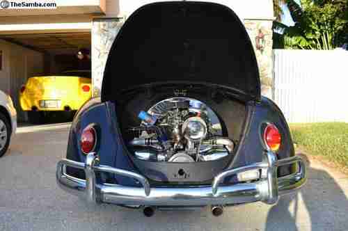 Rebuilt 1600cc motor, runs and drives great. This car was my daily driver for nearly two years. The odometer reads 39,115 however the previous owner did not know if it was correct when I bought the car and as such, I don’t either. I did a lot of work to this car to get it set up as a reliable daily. The car has a 2” narrowed adjustable beam which gets the car low, but not slammed, and has new shocks to match. I lowered the rear to match. The wheels were replaced with stock bug rims, which I had powdercoated satin black. The tires are NEW full size (165s) to keep the ride comfortable. Also while doing this I added all new brakes including brand new drums and bearings. The only modifications I made to the motor are a larger oil breather and electronic ignition for reliability, and the carhas a 12v charging system. The car starts up first try every time. The exhaust was replaced with the “Eurosport” style and it sounds nice, but isn’t obnoxiously loud. The interior is in good shape with the only exceptions being the headliner (new headliner included with the car) shifter knob, and dash grab handle. The car has an Autometer tachometer on the steering column. The front seats have brand new seat covers and the driver’s seat has new seat foam. The rear seat in great shape. The door panels are new as are the grab handles. I installed “Fat Mat” sound deadening on the floors and firewall area. The old grant wheel was replaced with an original style ivory one. The head unit has a pop out touch screen, auxiliary (headphone style) input and is capable all sorts of fancy stuff I never got a chance to use! I added two 6x9” Sony speaker boxes behind the rear seat and a 6” Sony speaker hidden behind the grille in the dash. The car has an older paint job (dark navy/cobalt blue metallic) and some small spots had flaked off. I touched them up to prevent rust. The paint on the rear apron does have some cracks due to the heat from the cars old exhaust.