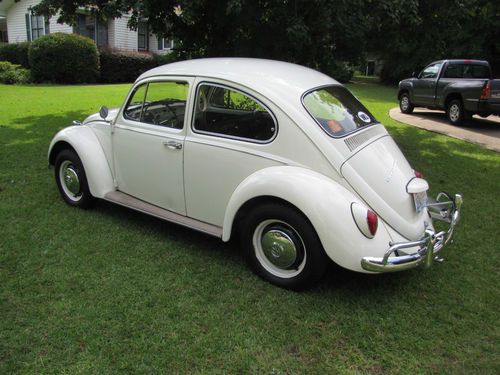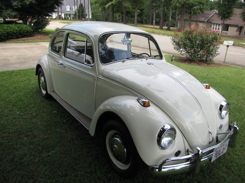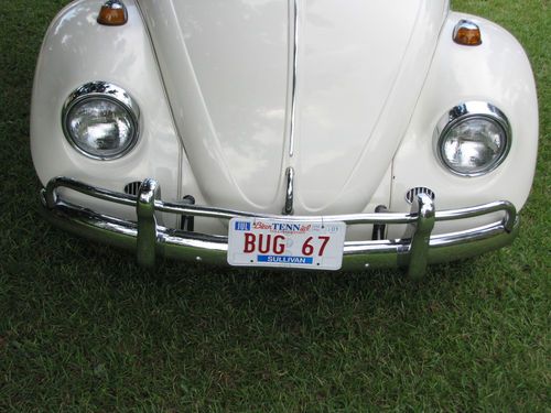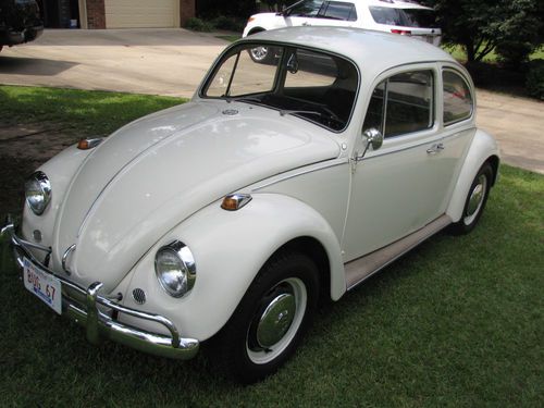 This is a 1967 original survivor beetle with 44,406 believed to be original miles from early records and interior condition. There is a small dent in the driver's door. The right front fender was replaced at some point as I can see sanding marks in the paint. Gas tank has been replaced. All original glass except front windshield which appears to be a German glass replacement. There is a small rock ding in the windshield about the size of a dime. Engine and transmission are in excellent condition. Engine starts immediately and shifter never pops out of gear. Rear pop out windows. Original spare tire, owners manual and jack with original tool pouch. Interior is all original, including the floor mats, and is in very good condition. Everything works on the car with the exception of passenger door latch. Door has to be closed hard to latch. Car was undercoated at dealership when new. It is now peeling in places as seen on the pans. I have owned the car for ten years and it has needed very few repairs. I replaced the wheel cylinders, brake shoes, some brake lines, and replaced the battery. If any questions, call me at 334 701 1179 and leave a message. I'll return your call.