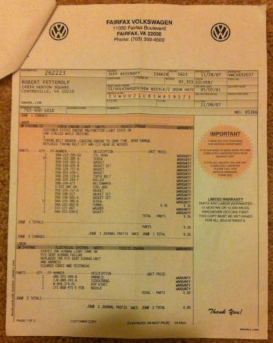 ...vehicle currently titled/registered/inspected in Fairfax County Virginia. Car is a dream to drive and works great. i just had to choose between this one and my 66 6 volt 1300 vw beetle, and i had to go old school. it was a difficult descision. the full size spare is on one of the front positions right now as the other aluminum rim has a flat and is in the spare tire well presently. the car could use new tires and pads replaced and rotors serviced, but as i said, it functions perfectly now and is safe and good to go! good luck! this is one awesome little car! below is a print out from a wwweb vw vin decoder site to give you a breakdown of some of the specs. ----------- Result of VIN decoding process (No guarantee) VIN: 3VWDD21C81M459573 WMI / VDS / VIS:3VW / DD21C8 / 1M459573 Model: New Beetle Make (Manufacturer): Volkswagen Model year: 2001 Country (Region): Mexico (North America) Plant: Mexico Sequential number: 459573 Get Certified Vehicle History Report OR Get Complete VIN Audit OR Get Reverse VIN Number Check Anti-brake system: 4-Wheel ABS Body style: HATCHBACK 2-DR Brake - front: Disc Brake - rear: Disc Cargo volume: 12.00 cu. ft. / 339.8 liter Consumption in the city: 22 miles/gallon / 10.7 liters/100 km Consumption on the highway: 27 miles/gallon / 8.7 liters/100 km Curb weight: 2964 lbs / 1347.3 kg Driveline: FWD Engine capacity: 4 Cylinder, 1.8 L, DOHC, Turbo Engine series: 4-Cyl. 1.8L Engine type: 1.8L L4 DOHC 20V TURBO Fuel tank: 14.50 gallon / 54.9 liter Fuel type: Gasoline Ground clearance: 3.90 in / 9.9 cm Overall height: 59.00 in / 149.9 cm Overall length: 161.10 in / 409.2 cm Overall width: 67.90 in / 172.5 cm Standard seating: 4 Steering Type: R&P Tires: 205/55R16 Transmission: 5-Speed Manual Overdrive, 4-Speed Automatic Overdrive Trim level: GLX Turning Diameter: 32.80 in / 83.3 cm Warranty distance: 24 000 mile / 38 000 km Warranty duration: 24 month Wheelbase: 98.70 in / 250.7 cm |