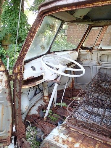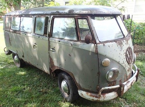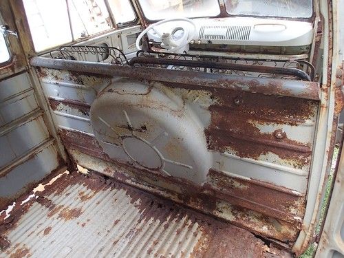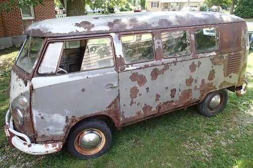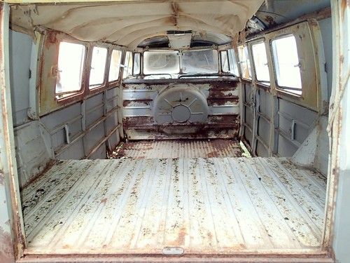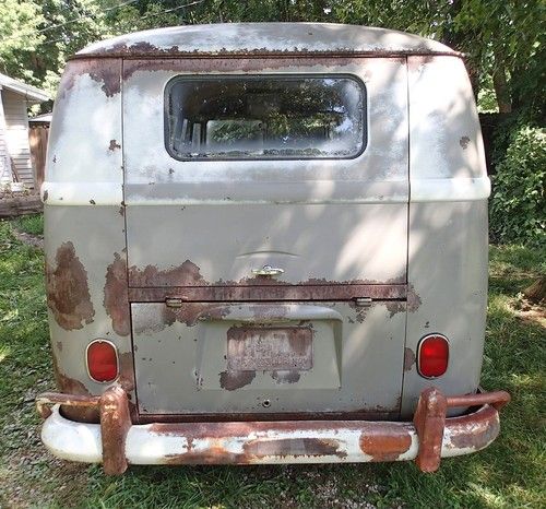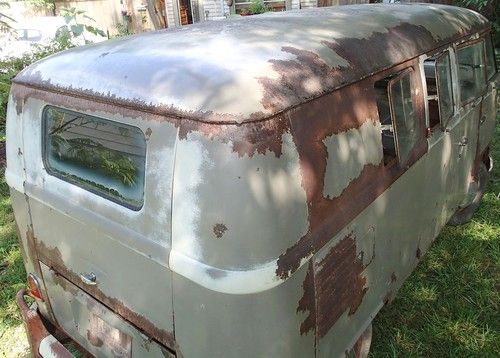 This auction is for an original paint, rustina Mouse grey and white VW bus project. An unusual color with a few bullet holes, killer patina, light pitting, Missouri rust rings, and strong paint elsewhere. Mostly complete less middle and rear seat; front 1/3 2/3 seats are very clean and solid with no rust. This bus would make a perfect patina driver with limited metal repair and a mechanical overhaul... or completely restore. If one chose to go the restoration route, I'm including a very nice full roof and bus front donor clip (really, much more than it needs). Rust is typical lower perimeter (widely available reproduction metal), plus some in the air vent, two spots in the roof (driver side front/passenger side rear), and driver side a-pillar, of which the donor metal included will help tackle. Also included are the salvageable pieces of the interior, extra interior trim, an Autocraft outer ds rocker, its four 15" bus wheels and good rollers, one front window and two Sigla glass replacements. Not pictured, but included, is a good, original passenger side battery tray. This bus has the desirable, one year only optional big brakes, taller reduction box gears, and 1500cc single port engine. Original engine turns over and has oil in it. Doors all open and latch. Original ignition with key. Clean title, great project!
