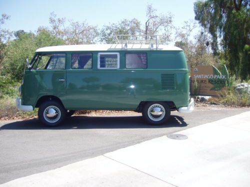 |  HIGH-END BRAND NEW RESTORATION of a WALK-THROUGH MODEL clean dry So. Calif VW Bus--Attention to DETAIL & QUALITY everywhere. Completely Rebuilt---DISK BRAKES, DUAL BRAKING SYSTEM, BETTER SUSPENSION, LARGER GAS TANK. NEW / REBUILT FRONT SUSPENSION & BRAKES.  NEW: Michelin Defender Tires, 1600 Dual Port engine (Powder coated tin, Alternator, Carb, Exhaust, etc), Freeway Flyer Geared Transmission, all Electrical is working, VDO gauges for engine. The STRAIGHT BODY IS RUST-FREE--Excellent Color:Original VW Velvet Green & Pearl White top. OPTIONS: Westfalia Drive-Away Tent, camp stool, and V W of America Roof Rack INTERIOR: ALL NEW Excellent open & Functional Floor Plan for Show, Day & Week end FUN. Birch & Maple Cabinets and Baltic Birch Paneling with a beautiful Bamboo floor. Original Camper Jealousy Windows for a nice breeze...Auxiliary Battery for interior lights, Stereo, etc. Again, Attention to Detail everywhere... This Camper in NEW Inside & Out, a JOY TO SEE & DRIVE-Ready to Show & Go |