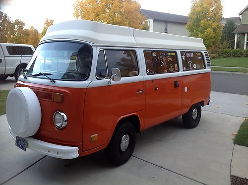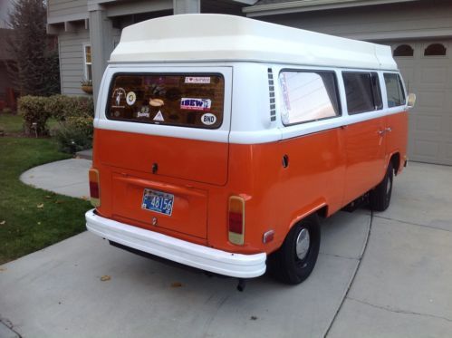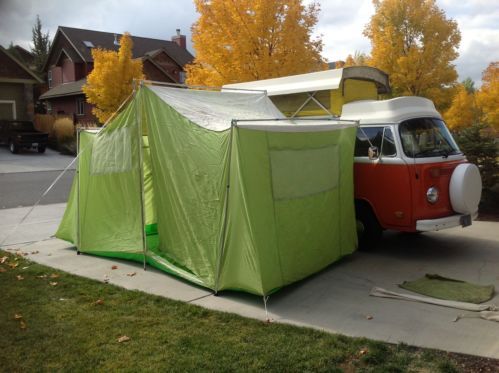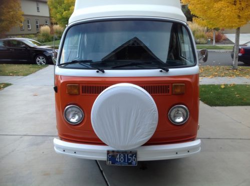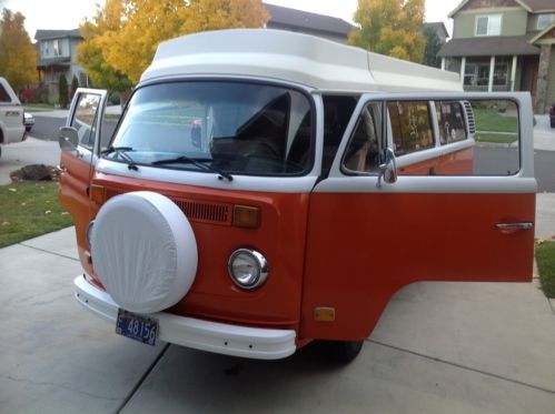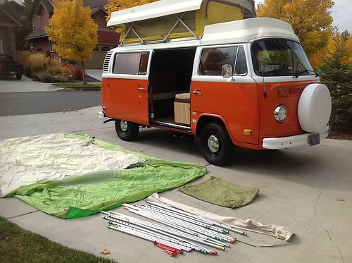 I am selling my 1975 Volkswagen Riviera Camper Bus. I have personally owned this bus for twenty plus years. It has always been garaged and well maintained. I live in the high desert of Oregon which only gets 9-11 inches of rain averaged per year. It has an original 1800 cc fuel injected motor (VW first year of EFI for the bus). The odometer shows 83,850. Probably 183,850. I have put 50,000 plus miles on since owning it. It has been repainted the original orange and white and was reupholstered 10 years ago. I had them wrap the foam from the cushions in waterproof material and the upholstery is zippered to be able to remove the foam and clean the upholstery if needed. I had a new upgraded 4 speed manual transmission installed professionally at the beginning of the year at a cost of $2000 plus. Since my ownership of this van I have also had the engine professionally rebuilt. There are zero mechanical issues that I am aware of. This bus starts and runs like a new 2013 VW. All the camping equipment works great. The sink has an electrical pump or can be done manually as well. The refrigerator is an icebox and is well insulated. Propane is piped under the jump seat for easy cook top use. Headliner is impeccable, and so is the dashboard. Pop top fiberglass is excellent, as well as the canvas and screens. Minor tears in the screens have been patched. The tent that connects to the bus was included when I purchased the van and comes with the instructions. This tent can be a stand alone tent, but was made to fit right along side the bus and attaches to the bus when the side slider door is open. Like the Riviera pop top both the canvas and screens of the tent are in excellent condition. The bus has never been in an accident as far as I am aware of. The body is extremely straight and well preserved. The few issues the bus has are as follows. Very very small oil leak. I have yet to replace the original captains chairs. There are a few lighter scratches on the exterior paint. The exterior body is a true survivor with very minimal surface rust. It has one small issue of bubbling under the rear bumper. Floor pans are good with some surface rust and a very small issue on the drivers side floor pan. In over twenty years this bus has only let me down once when the original transmission failed. It has been a great reliable van for myself and my family, in both transportation and camping. I would not hesitate to drive it across the country. I always get tons of compliments of those passing by and will hate to see it go. Overall this Volkswagen is a 9+ out of 10. Also included are 4 like hanhook studded snow tires mounted on rims. Happy bidding!!!!