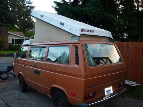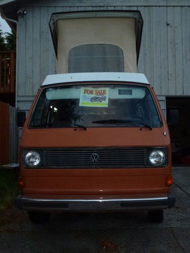You'll be the coolest thing on the block or pulling into a campground when you motor in and pop up the top on this 1982 well maintained VW Campervan. Enjoy the pleasure of cooking on a built in stove and an ice cold refrigerator that runs off 120, 12V or propane. Built in sink, and sleeps 4 with a bottom and top bunk. Look around and you'll see lots of these for sale, and boy are they expensive! GoWesty has them for $70,000 or more. This van is complete, and everything works, including the factory propane heater. Comes with correct tires, a factory bicycle roof rack that will carry your surfer-dude boards as you camp along the Oregon coast or Baja's beaches The frame mounted bicycle carrier will carry your bicycles for trekking the Cascades or Joshua Tree. You won't find a van with a straighter body, all intact glass and complete factory window dressings and screens. The rebuilt original engine runs like all the rest of the Westies and you'll learn to love life in the slow lane as all the aging hippies wave hello at you! More pictures available, come up and test drive it soon. Won't last long at this price.
