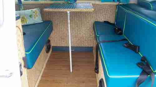 Options: Pop-up Camper Top (new), Ratchet action rear-seat to double bed (new), Ceramic glass tile center table, Beach thatch insulated headliner and walls, Padded Center Console with 110 volt outlet, Dual Batteries with recharging unit to wall power, Leather Seats, CD Player