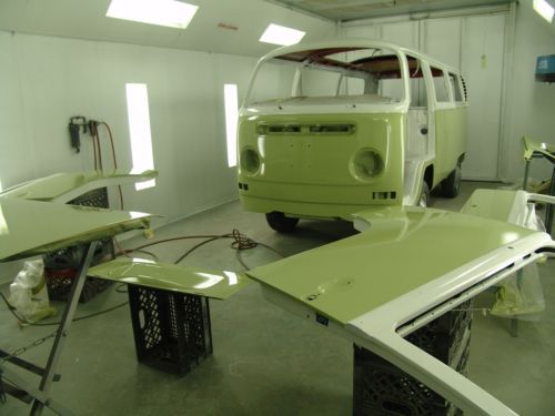 in multiple coats on the top half and the complete interior of the bus then a gallon of beryl green was applied in multiple coats on the