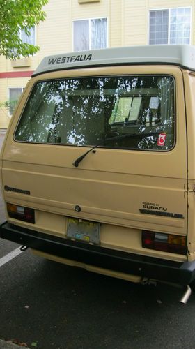 1985 VW Westalia with a Subaru EJ 22 Engine. The engine Has new timing belt roller tensioner , water pump, thermostat and crank seal. All gaskets are new. The Westy has headers Magna flow exhaust and catalytic converter. Carat rims with michelin agilis tires that have 90% of tread left. New stainless steel coolant pipes , hoses and clamps , cold air intake with carbon fiber K&N style cone filter , new power steering lines and fluid. The brake fluid was flushed, new left front caliper , new remote control JVC stereo with Bose speakers in the rear with Amps. I left the Blaupunkt speakers in the front doors as nothing was wrong with them. Everything with the kitchen camping equipment works very well with no leaks. The pop top has no tears no stains and the screen is in great shape as well.The interior is very clean People who see the interior always comment on the condition. Did I mention that the Air conditioning works powerfully and cold. My Westy does not leak oil , coolant or any fluids. It starts first turn of the key and will climb the steepest of hills with no problem. This Westfalia is a lot of fun to drive. Also has new clutch.