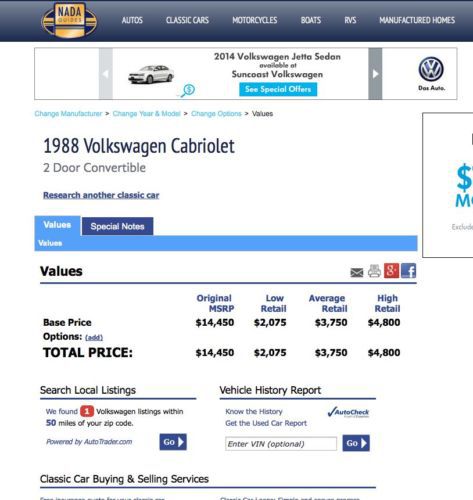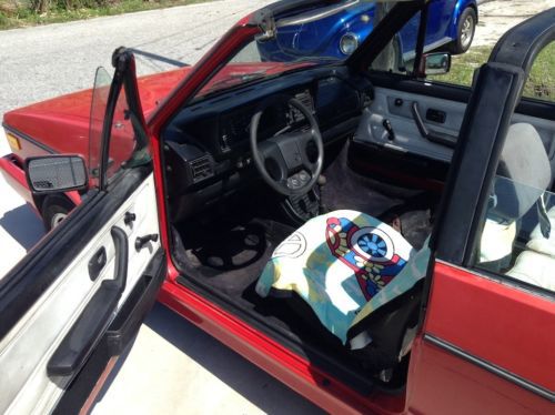 1988 VW Cabriolet "beach car" Selling as dependable, fun transportation or ultimate parts car w/clear Florida title. We have more in the clutch and brakes than the price of the car! FIRST $995.00 CASH drives away! Runs great and straight down the road. Brand new Sachs clutch, clutch cable, throw-out bearing, pressure plate ($793.45) CV boots replaced w/German replacement boots. ($268.10) Brand new front brakes and both front rotors also new. ($462.77) Both seats are in car, one seat out to show the interior better. Top is pretty much shot, NOT 100% waterproof, rear window in tact. Cosmetic TLC and loose dirty seats are the worse things. Shift is a bit sloppy, but zero problems getting in any gear, including reverse. Odometer stopped at 120k, speedometer works as it should. A/C not working. Steering leaks a bit. Same older owner over 24-years, he just bought a new car as this one needed more work than he could afford, so we did the work to keep it alive and kicking! Drive, restore, beach ride, or hate to say it - but ultimate parts car if you have a Cabriolet. We simply don't part out cars here at Sunshine Auto Garage - where "No VW should ever die"... That's up to you. Stop by and see the car. Located in Sarasota. Sold as is where it is. Not everyone wants a restored car, this is just fun beach transportation or perfect to run errands on a sunny day. ***My mechanic just scraped the rear quarter today 6-5-14. Not bad, but see pics. Grrrrr. sunshineautogarage.com "No VW should ever die" |