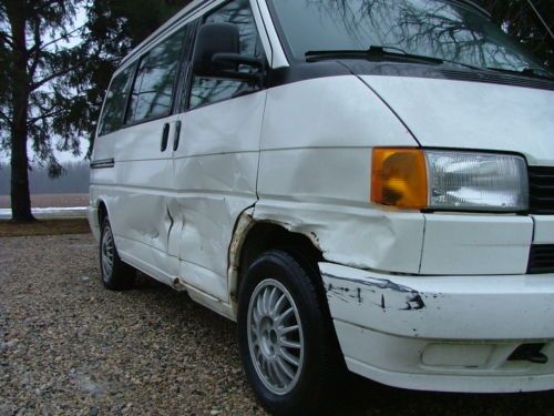 1993 Volkwagen Eurovan with a slight scratch on the passenger side. It was either have a 10-12 point buck in my lap last fall or hit a guardrail. In hindsight I'm not sure I made the right choice. You can see the bad from the pics and I'll give you the good as it is. This van was a faithful steed that we loved camping in. I maintained it well. It had the transmission rebuilt in January 2009 to the tune of $2800....I still have the receipt. I put a new heater core in it 2-3 years ago and at that time replaced every hose on the thing...even the ones going to the auxillary heater in the back. It runs and drives. Drove it home...a 2 hour drive after the accident. I start it every month or so and take it up and down our road. The tires are pretty well shot. If it weren't for a couple almost baldies I wouldn't be afraid to drive it anywhere. The starting price is local scrap value. I hate to see it go that way. Hopefully someone has some use for it. The passenger door and sliding door will not open. I'm sure they will with a crow bar but haven't went that route.
